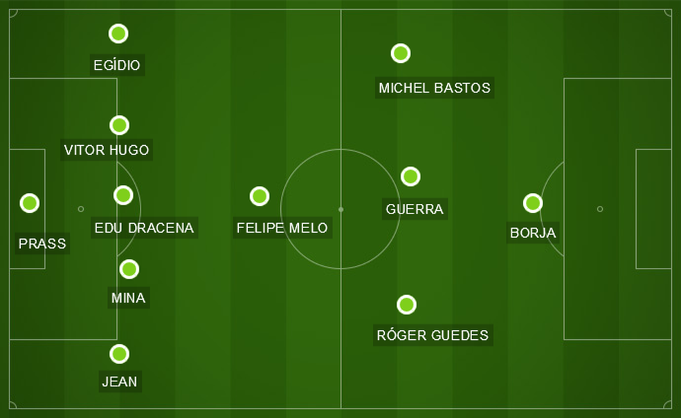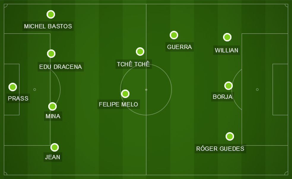 Com Dudu suspenso, Eduardo optou por mudar o esquema tático, colocar um homem a mais na defesa (o zagueiro Vitor Hugo), trocar o volante Tchê Tchê por Michel Bastos e armar uma linha de cinco jogadores à frente do goleiro Fernando Prass. Assim, o treinador deixou de lado o usual 4-1-4-1 e o Verdão entrou em campo com uma espécie de 5-1-3-1, com três zagueiros (Mina, Edu Dracena e Vitor Hugo) e os dois laterais (Jean e Egídio) na primeira linha.