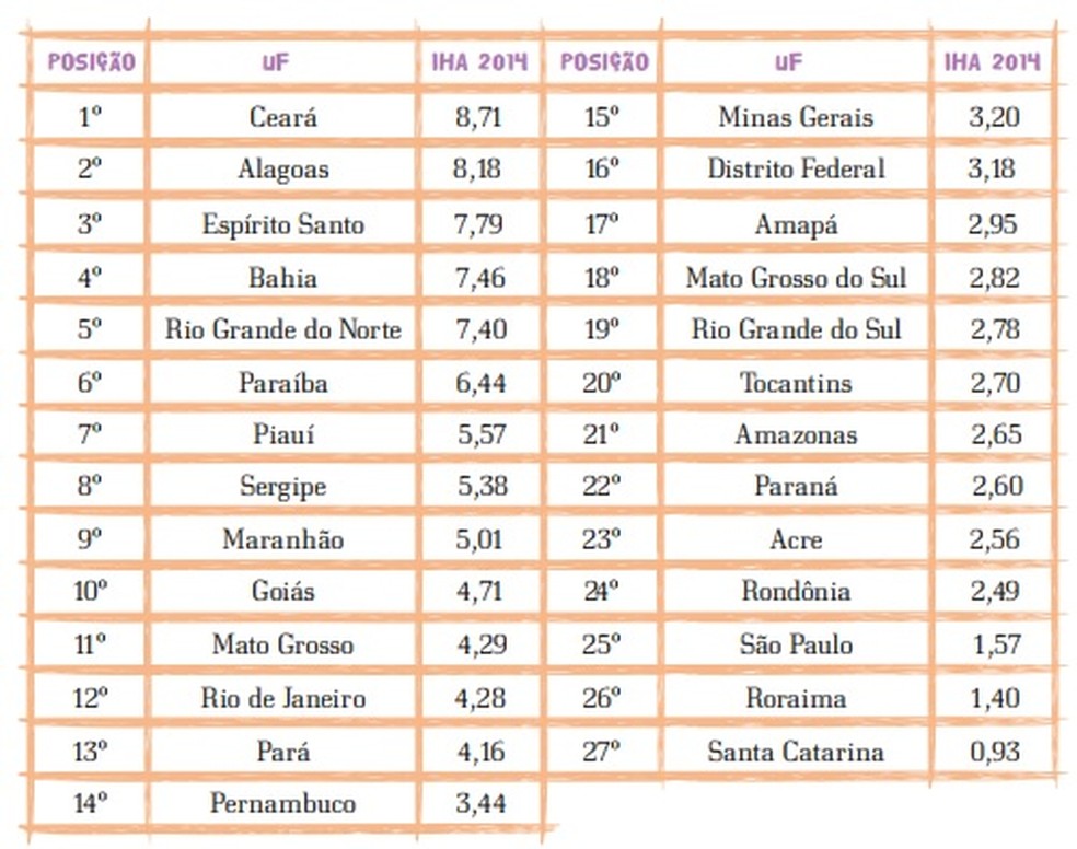 Conforme a Unicef, o índice no Ceará é 8,71; em segundo lugar no ranking negativo aparece Alagoas, com 8,18. O número de adolescentes mortos no Ceará em proporção à população é quase 10 vezes maior que o do estado que aparece com o índice mais baixo, Santa Catarina, com 0,93.