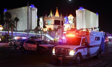 LAS VEGAS, NV - OCTOBER 02: An ambulance leaves the intersection of Las Vegas Boulevard and Tropicana Ave. after a mass shooting at a country music festival nearby on October 2, 2017 in Las Vegas, Nevada. A gunman has opened fire on a music festival in Las Vegas, leaving at least 20 people dead and more than 100 injured. Police have confirmed that one suspect has been shot. The investigation is ongoing. Ethan Miller/Getty Images/AFP== FOR NEWSPAPERS, INTERNET, TELCOS & TELEVISION USE ONLY == Foto: Ethan Miller / AFP