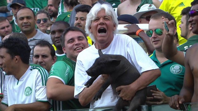 ...mas não é! Um torcedor do Palmeiras conseguiu entrar no estádio Olímpico com um porco de verdade. Ele ficou com o animal durante o jogo na torcida do Verdão. Veja abaixo.