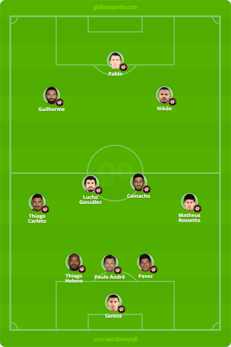 O provável Atlético-PR, portanto, tem Santos; Pavez, Paulo André e Thiago Heleno (José Ivaldo); Rossetto, Lucho González, Camacho e Thiago Carleto; Nikão, Guilherme e Pablo.