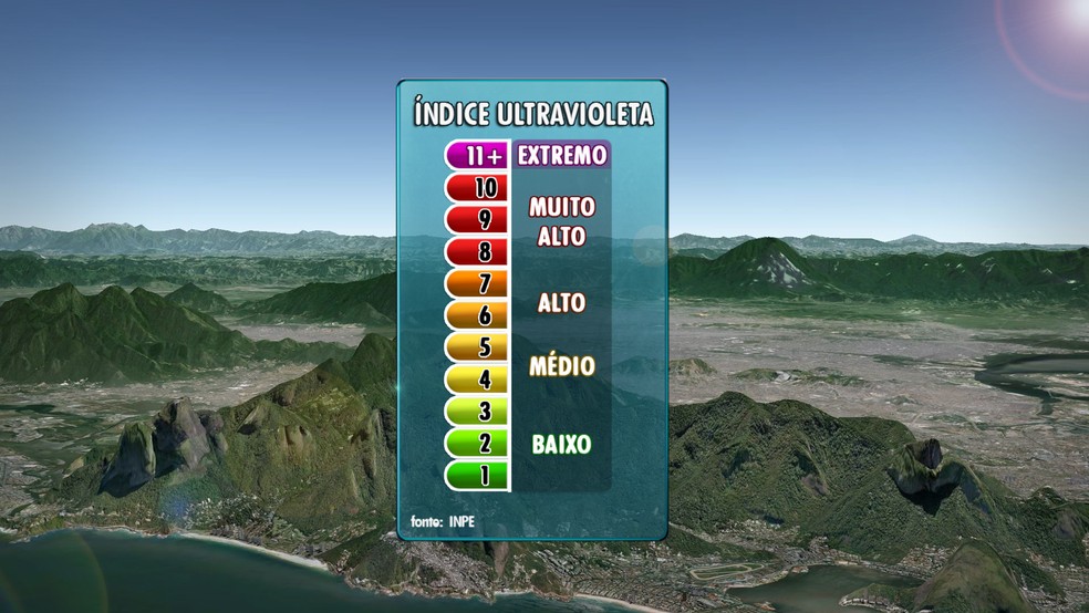 Valores superiores a 11 são considerados de dano extremo à saúde. Quando mais próximo da linha do Equador, maior o índice de radiação. Com escala de 0 a 15, o Índice Ultravioleta (IUV) aponta os riscos de se expor ao sol.