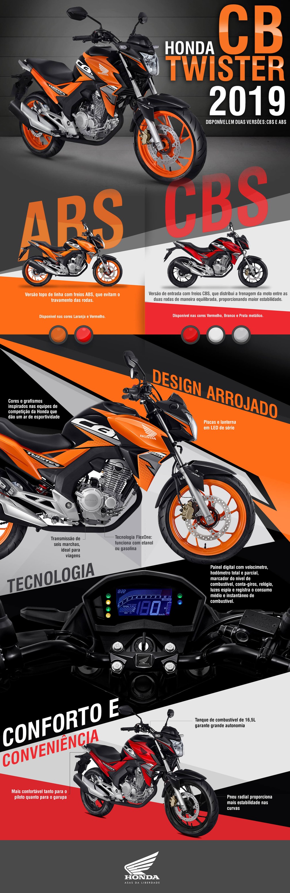 A CB Twister 2019 está disponível em duas versões: CBS e ABS.