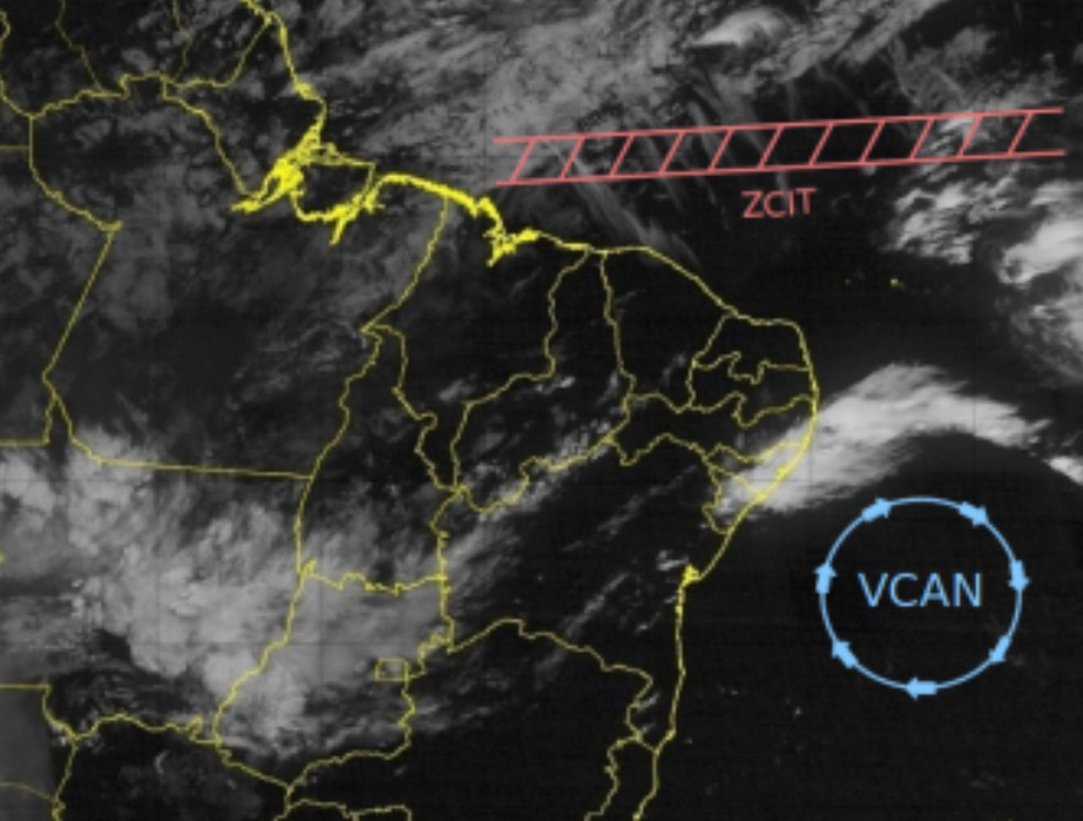 Vórtice Ciclônico de Altos Níveis (VCAN) está a leste do Nordeste e deve apresentar posicionamento da sua borda norte mais favorável às precipitações. — Foto: Funceme