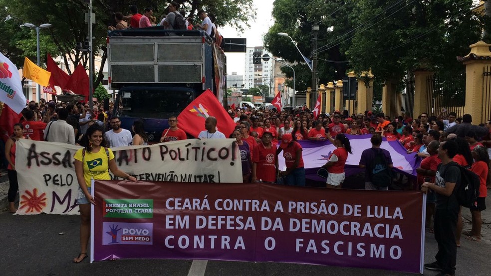 Um grupo realiza na tarde desta quarta-feira (4) um protesto contra a possibilidade de prisão do ex-presidente Luiz Inácio Lula da Silva. Os manifestantes circulam pelas ruas do Centro da capital cearense com cartazes e faixas com mensagens de apoio a Lula. Conforme organizadores, cerca de 200 pessoas participam da manifestação. A Polícia Militar do Ceará não divulga estimativa de público presente.