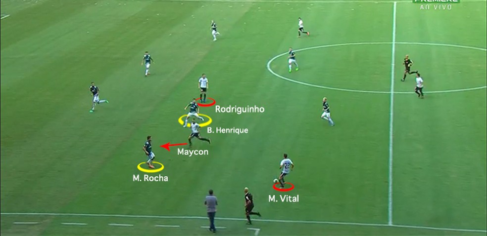 O Palmeiras sentiu o nervosismo da decisão e demorou para entender o tempo do jogo. Se o Corinthians estava em vantagem, não fazia sentido se recolher e procurar pressionar muito a bola para recuperar e avançar rápido, como na imagem. Mesmo chegando, o que o contexto da partida pedia era que o Palmeiras entrasse em modo “ataque”, trocando passes para quebrar o Corinthians, e não apenas buscando “surpreender” o Timão, que se organizou em 2 linhas de 4 e fechou bem a área com os volantes fechando as opções de jogo do Palmeiras por dentro.
