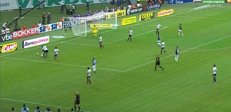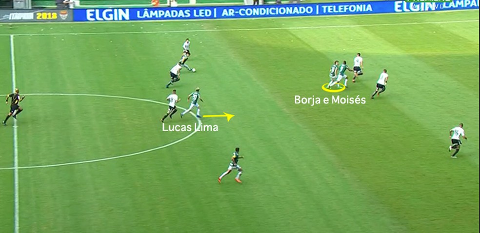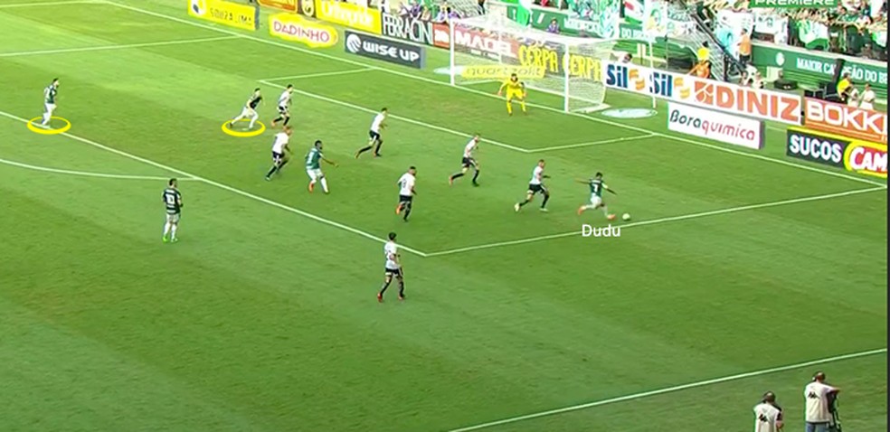 Isso aconteceu depois dos 30 do 2º tempo, com Moisés e Bruno Henrique se revezando entre ficar e sair e o Palmeiras apostando muito no cruzamento rasteiro para a área, como na imagem: Dudu recebe, inverte a bola de lado e espera a chegada de Bruno Henrique, Willian ou Lucas Lima. Cássio interceptou inúmeras bolas assim, com a defesa toda fechada e olhando para a bola, enquanto os outros jogadores do Palmeiras tinham o foco em receber no espaço livre.