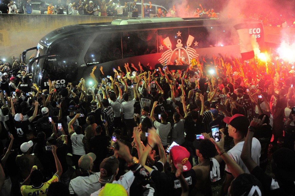 Ônibus do Corinthians chega à Arena (Foto: Marcos Ribolli)