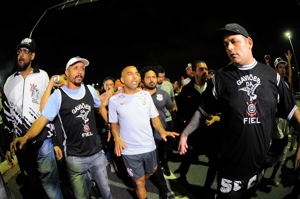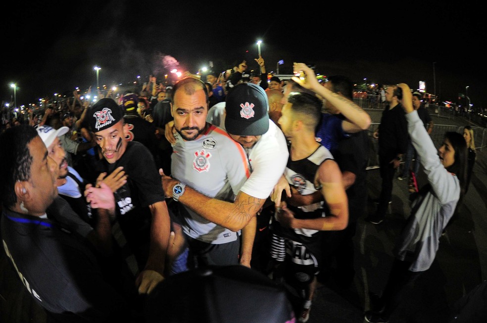 Torcida do Corinthians recepciona o time na Radial Leste, na porta da Arena (Foto: Marcos Ribolli)