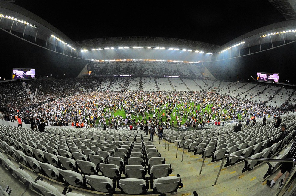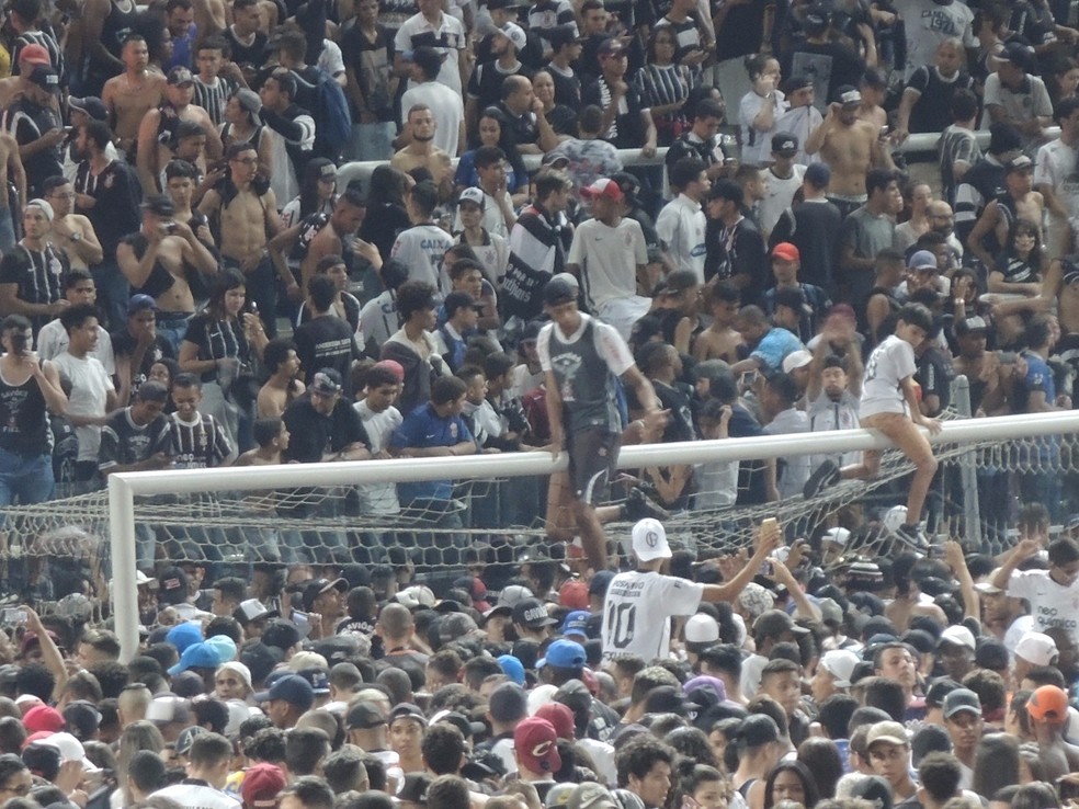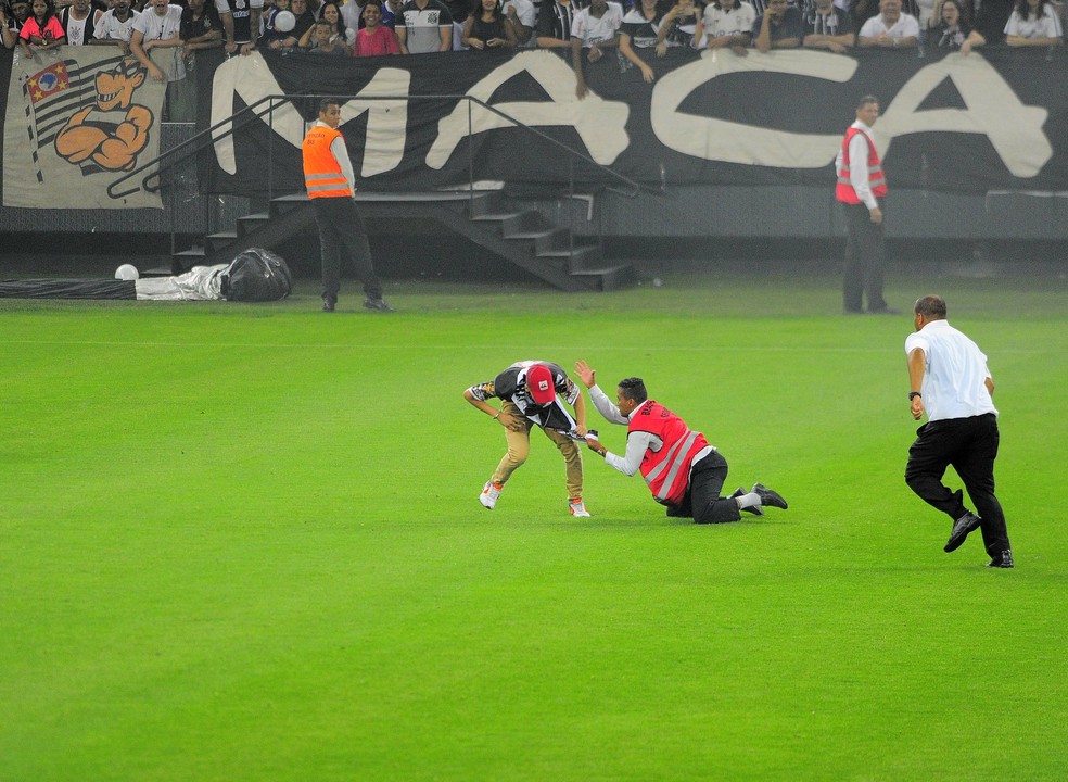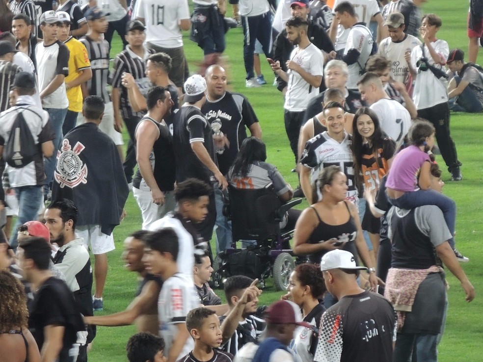 Depois que os jogadores deixaram o campo, milhares de torcedores invadiram o gramado da Arena, motivando até um recado do locutor do estádio: