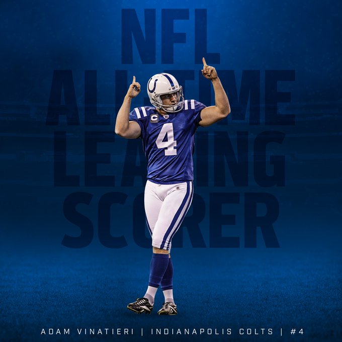 Aos 45 anos, Adam Vinatieri continua fazendo história. Na vitória dos Colts contra os Raiders por 42 a 28 neste domingo (28), o kicker ultrapassou Morten Andersen e se tornou o maior pontuador de todos os tempos na NFL com 2.550 pontos. Vinatieri empatou a marca com um ponto extra e field goal no primeiro quarto, passando com um FG no final do segundo tempo.