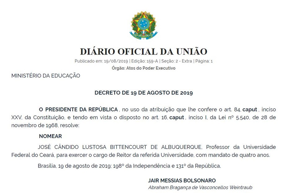 Nomeação do novo reitor da UFC saiu nesta segunda-feira (19). — Foto: Reprodução/DOU
