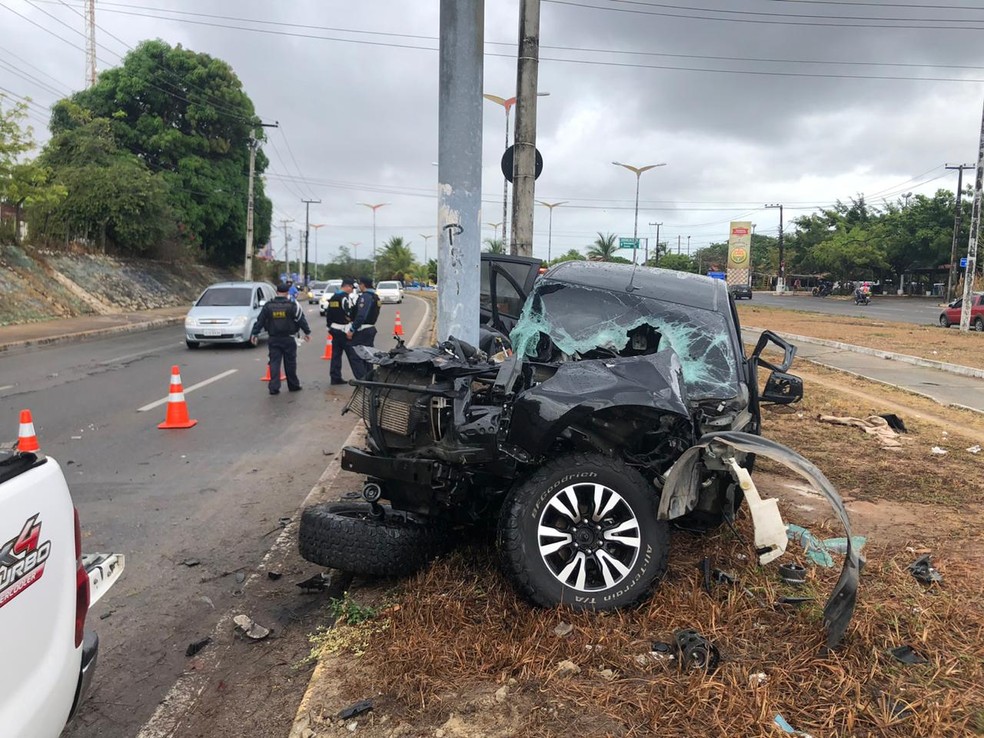 Na CE-040, no Bairro Messejana, uma picape chocou-se com um poste — Foto: Isaac Macêdo/SVM
