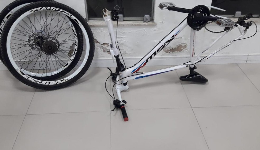 Bicicleta roubada pelos suspeitos horas antes de invadirem a residência foi recuperada pela polícia. — Foto: PM/ Divulgação