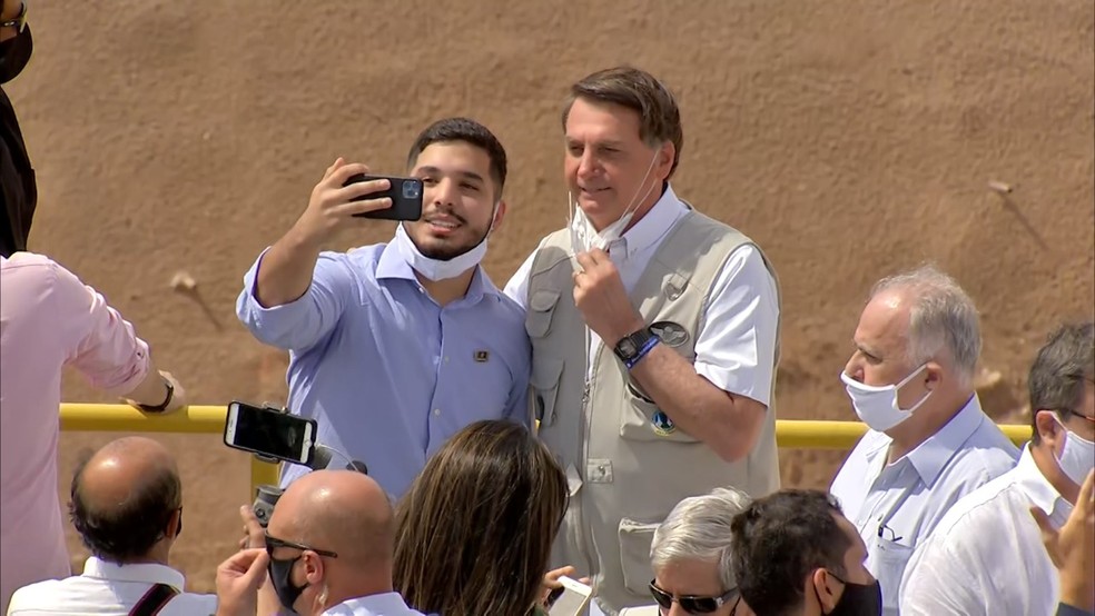 Bolsonaro estava usando máscara, mas chegou a retirá-la para gravar vídeo e posar para fotos, como quando estava ao lado do deputado estadual cearense André Fernandes (PSL). Ele estava acompanhado de autoridades como os ministro do Gabinete de Segurança Institucional da Presidência, Augusto Heleno, e do Desenvolvimento Regional, Rogério Marinho.