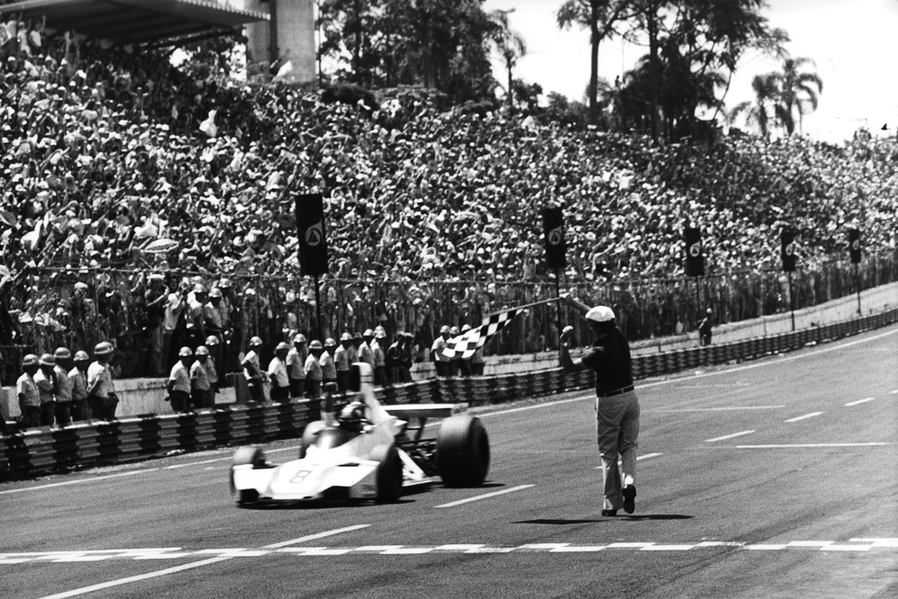 José Carlos Pace cruza a linha de chegada para vencer em Interlagos — Foto: Getty Images