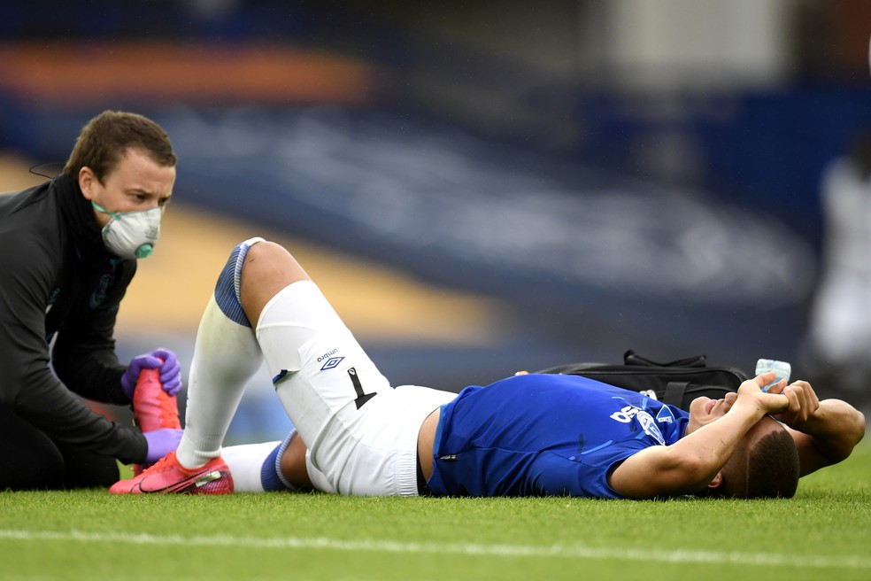 Richarlison é atendido pelo médico do Everton durante o jogo contra o Leicester — Foto: Clive Brunskill/Getty Images
