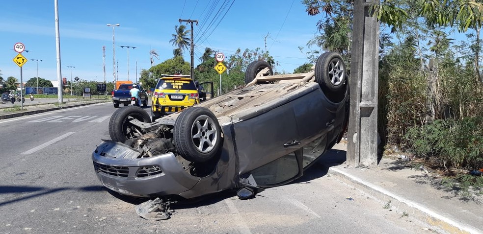 O carro capotou, na CE-060, na Grande Fortaleza, após o um ônibus colidir com a traseira do veículo — Foto: Leàbem Monteiro/SVM